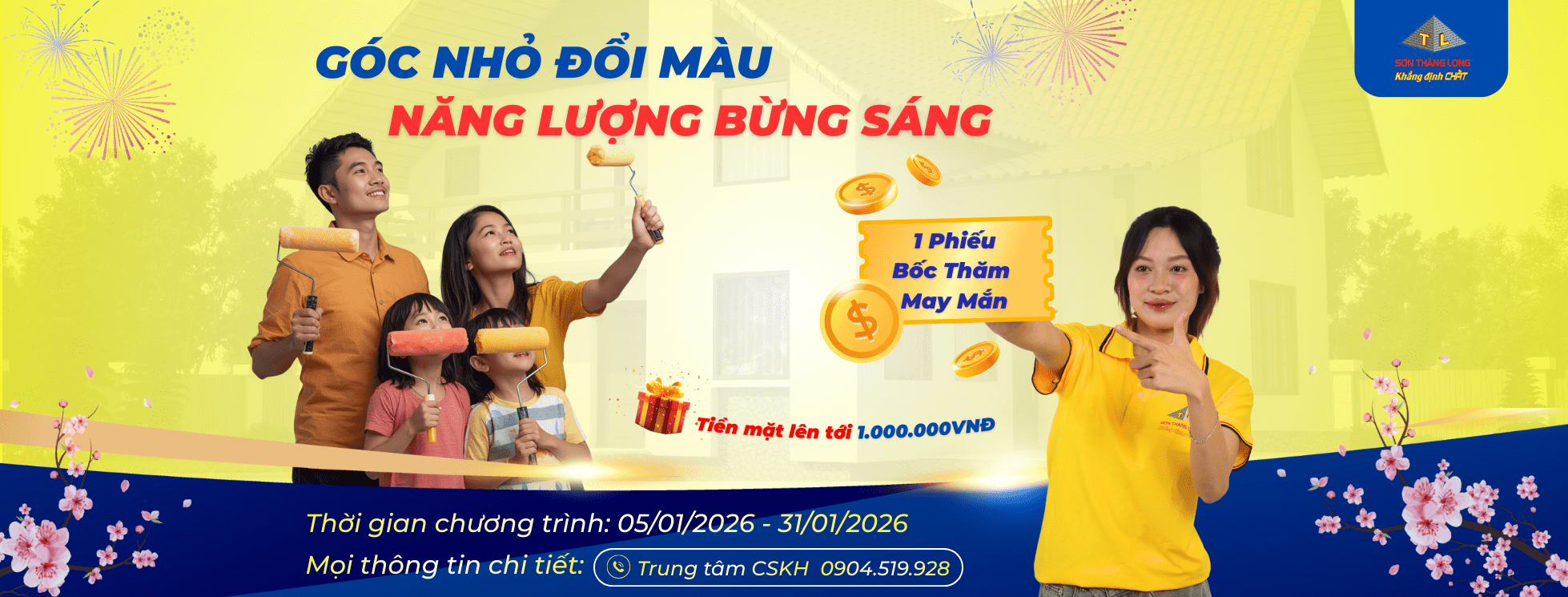 Cùng Sơn Thăng Long làm bừng sáng ngôi nhà của bạn, đón chào năm 2026 đầy hứng khởi và nhận phần quà tặng tiền mặt có giá trị lên đến 1.000.000 VNĐ.