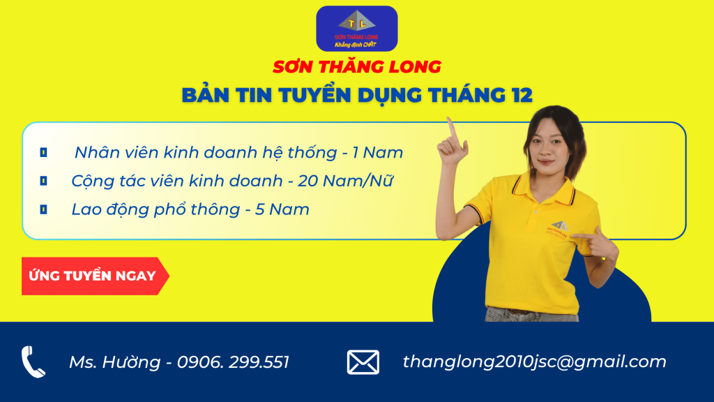 Tháng 12 này, Sơn Thăng Long đang mở rộng đội ngũ và tìm kiếm 25 đồng đội mới cho hai mảng công việc: lao động phổ thông ổn địnhcộng tác viên kinh doanh đột phá.